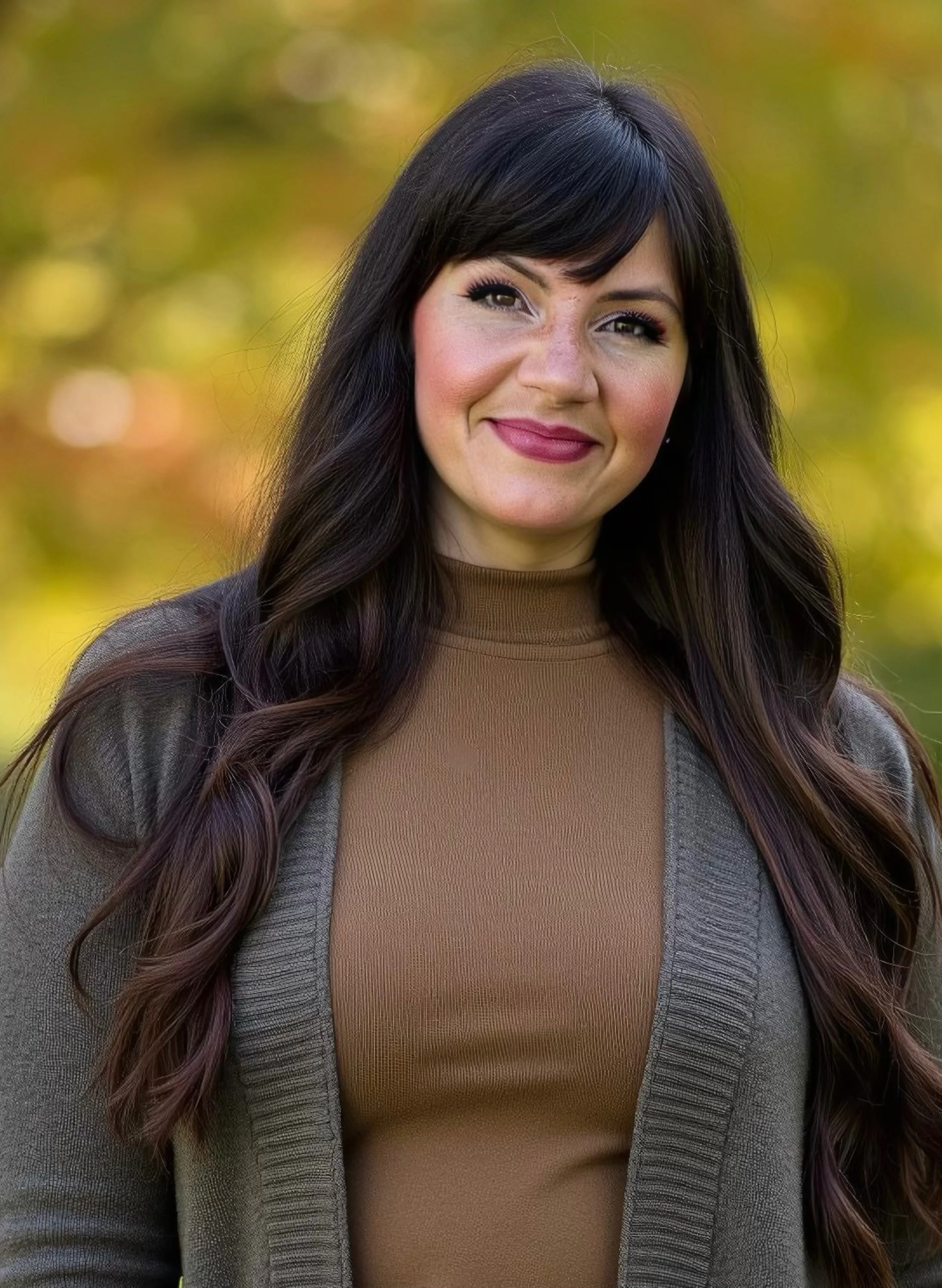 A woman with long dark hair smiling outdoors with autumn foliage in the background.