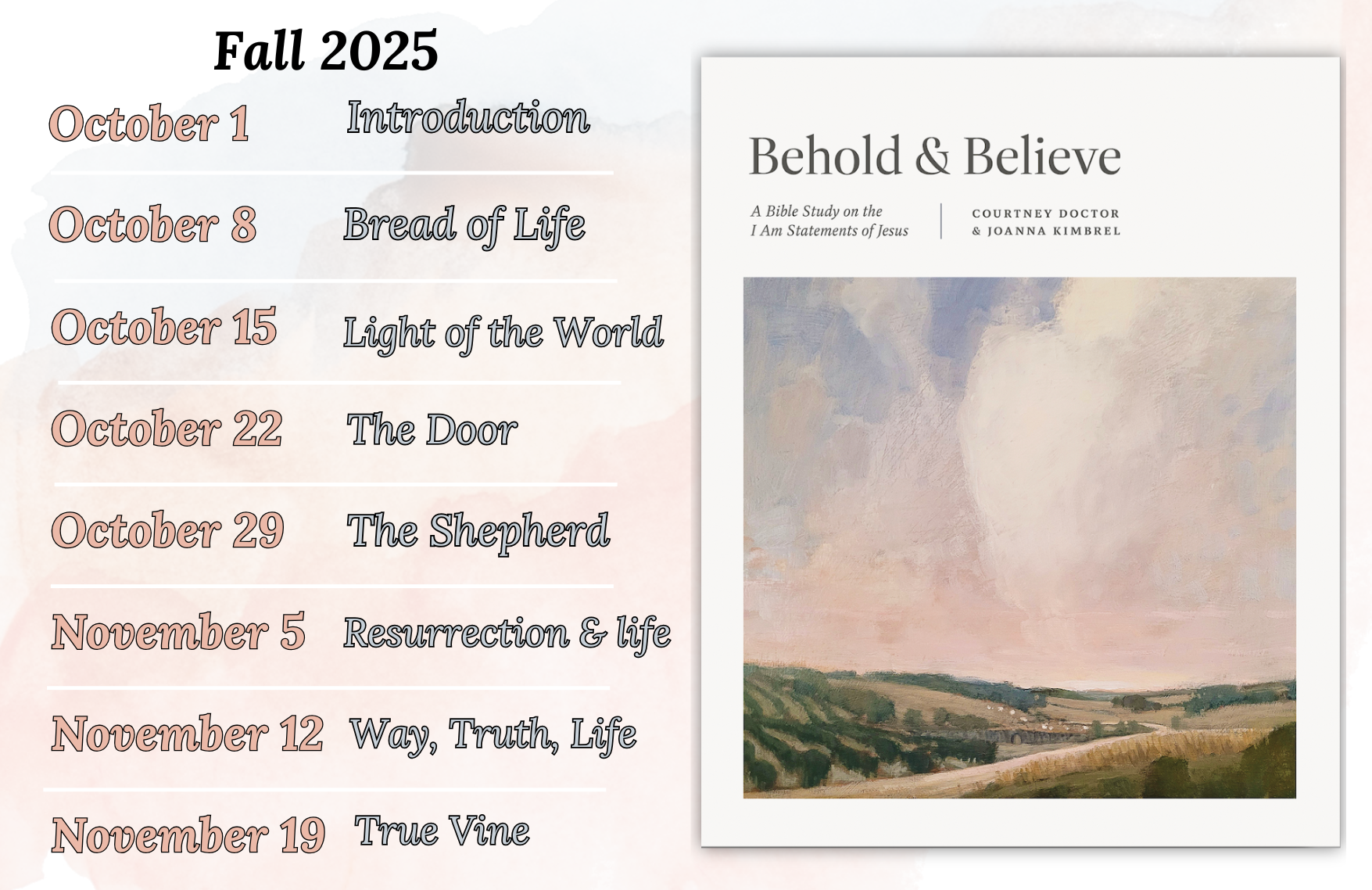 Our next online ladies’ Bible study will walk through Behold and Believe by Joanna Kimbrel and Courtney Doctor, a 8-week journey through the “I Am” statements found in the Gospel of John.
